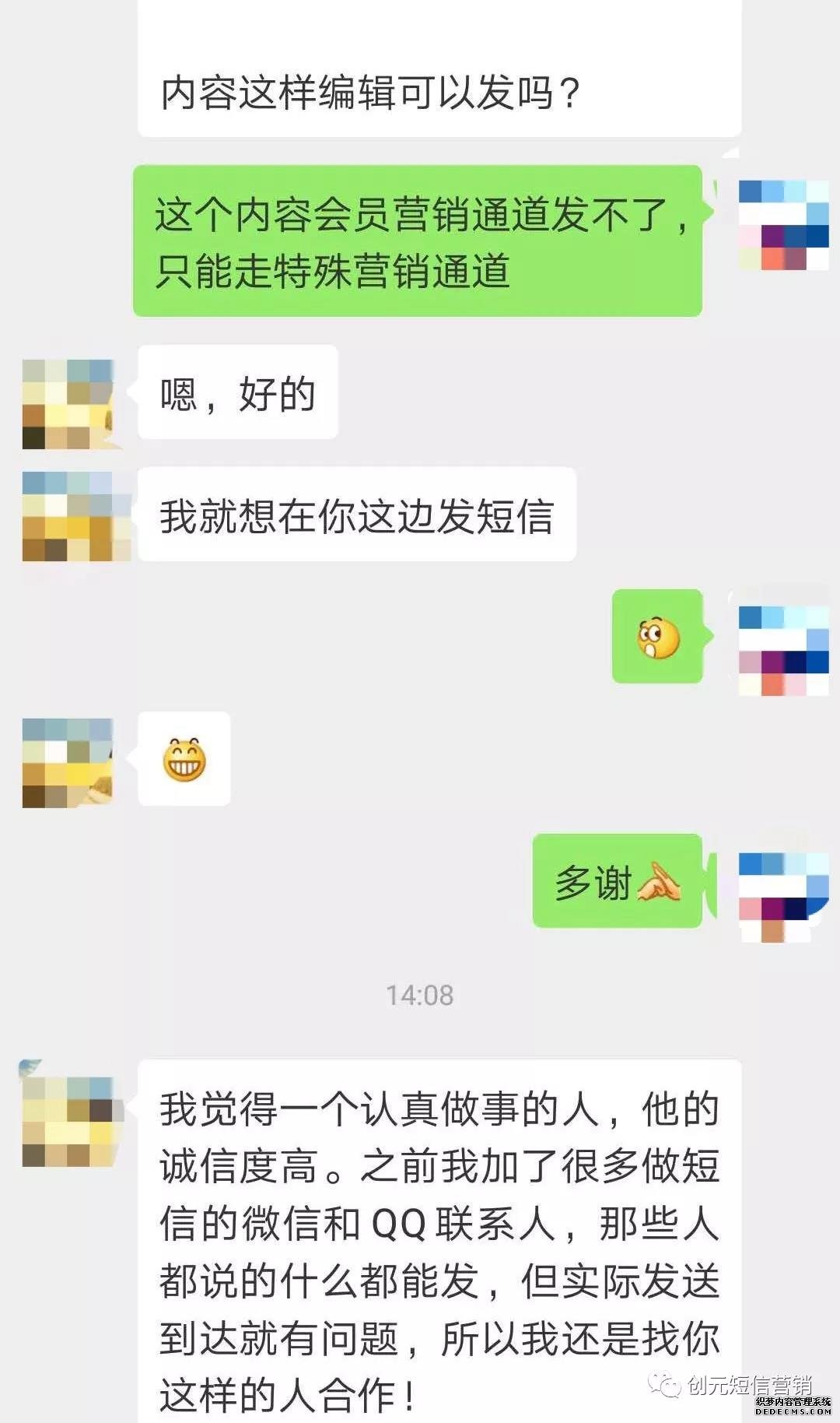 先前短信群發(fā)軟件客服,遇到過(guò)一個(gè)客戶(hù),問(wèn)短信內(nèi)容能不能發(fā),客服如實(shí)告知客戶(hù)能走什么類(lèi)型的通道,不同類(lèi)型的通道價(jià)格不同。客服與客戶(hù)之間的聊天都是坦誠(chéng)相告。