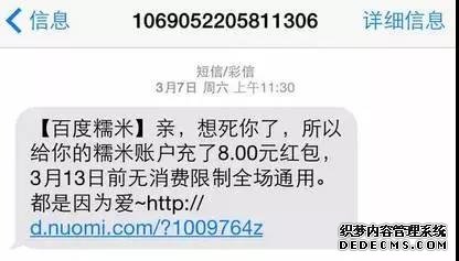 如果換成:“親,想死你了,所以給你的糯米賬戶充了8元紅包……”短信收到時的提示也就顯示這么長了,這種內容被打開的幾率是不是大一些?