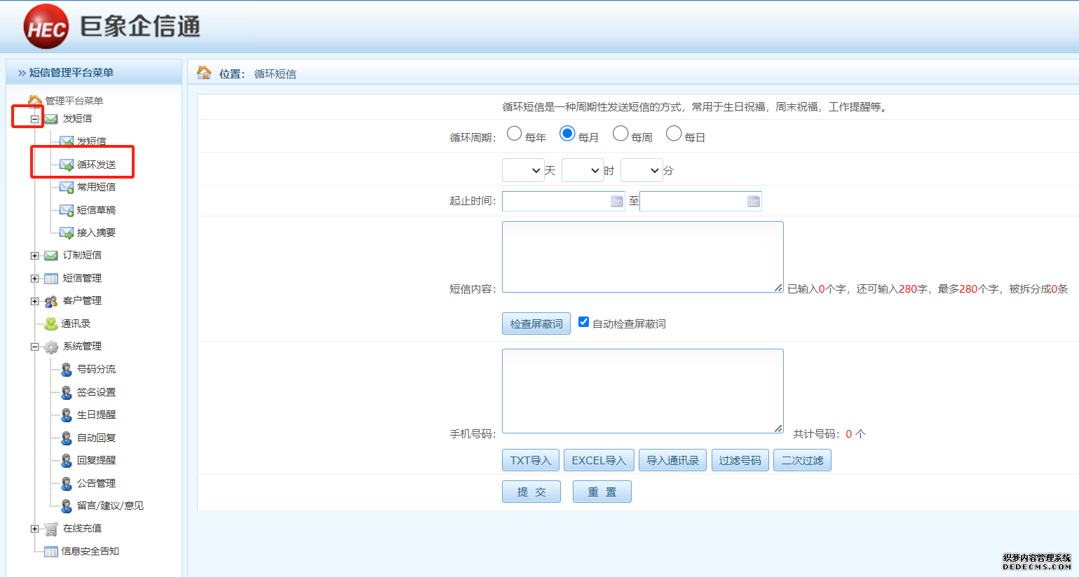 三、自動定時給員工、客戶、會員發循環短信,操作方法如下圖所示(循環短信是一種周期性發送短信的方式,常用于生日祝福,周末祝福,工作提醒等)