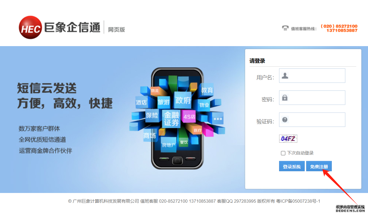 一、發(fā)送招工短信、招聘短信,首先用電腦或手機(jī)登錄巨象短信群發(fā)平臺(tái)首頁(yè)