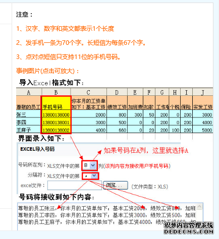 2、員工工資條短信群發(fā),即每個(gè)員工的基本工資、績(jī)效等都不一樣的變量短信群發(fā)操作如下圖所示。有三種個(gè)性化變量短信提交方法,可根據(jù)您自身資料格式選擇其中一種。